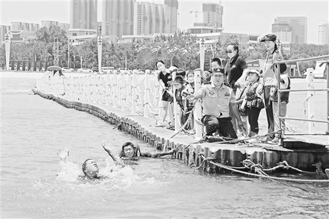 7月8日,烟台市公安局清泉寨海岸派出所联合专业救援队伍,在海边娱乐场所向游客开展防溺水安全宣传。连日来,针对海边游客增多的实际,清泉寨海岸派出所民警通过开展巡逻防范、强化警示提醒以及组织专业救援人员现场演示落水后如何开展救援和自救等方式,进一步提升游客们的安全意识和自救能力。臧保东摄(工人日报7月14日6版)