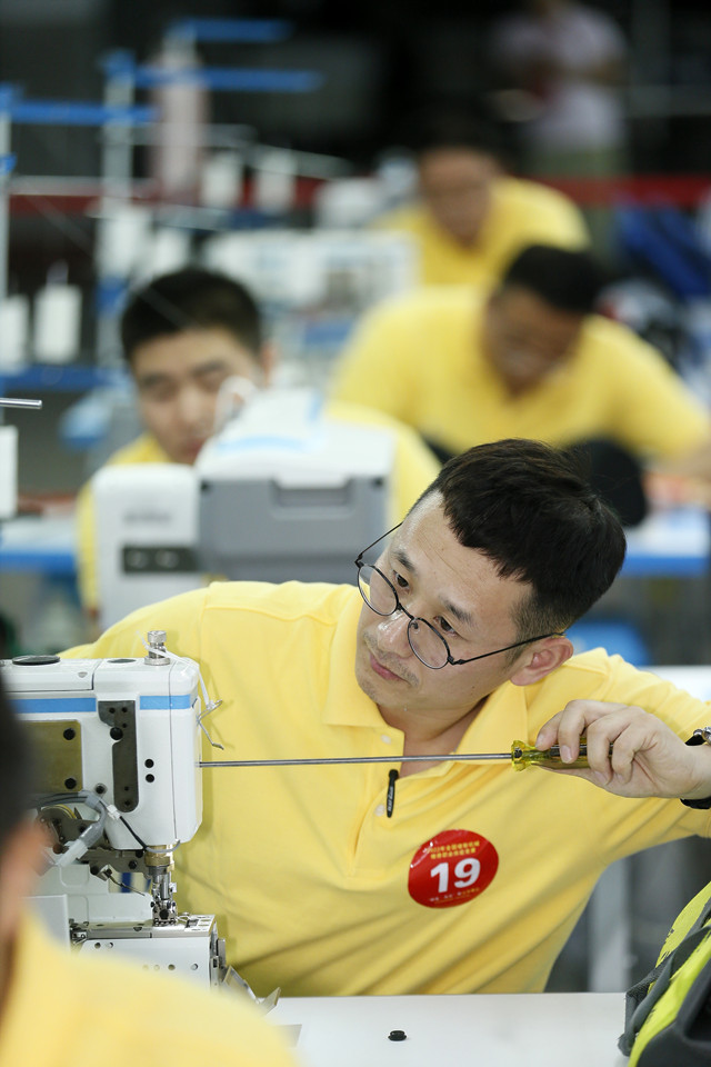当日,全国缝制机械维修职业技能竞赛山东分赛区比赛在山东省青岛市即墨区举行。来自山东省纺织企业的60名选手,针对包缝机、套结机、锁眼机等设备的故障排查和修复展开比拼。新华社发(梁孝鹏摄)