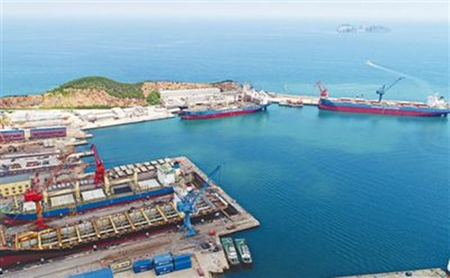 7月11日,位于山东省荣成市好运角旅游度假区的荣成新霞修船有限公司,来自韩国、新加坡等国家,以及中国远洋等企业的多艘船舶停靠在码头进行维护保养,一派繁忙景象。王福东摄(人民日报7月13日3版)