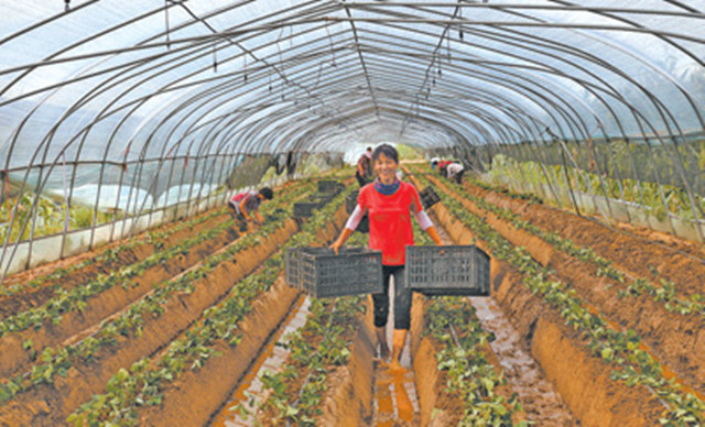 菏泽市高新区大力发展高效生态农业,优质草莓带动1000多人增收致富,亩均产值达5万元左右。图为马岭岗镇安顿庄村村民在草莓大棚作业。何 青摄(人民日报7月15日18版)